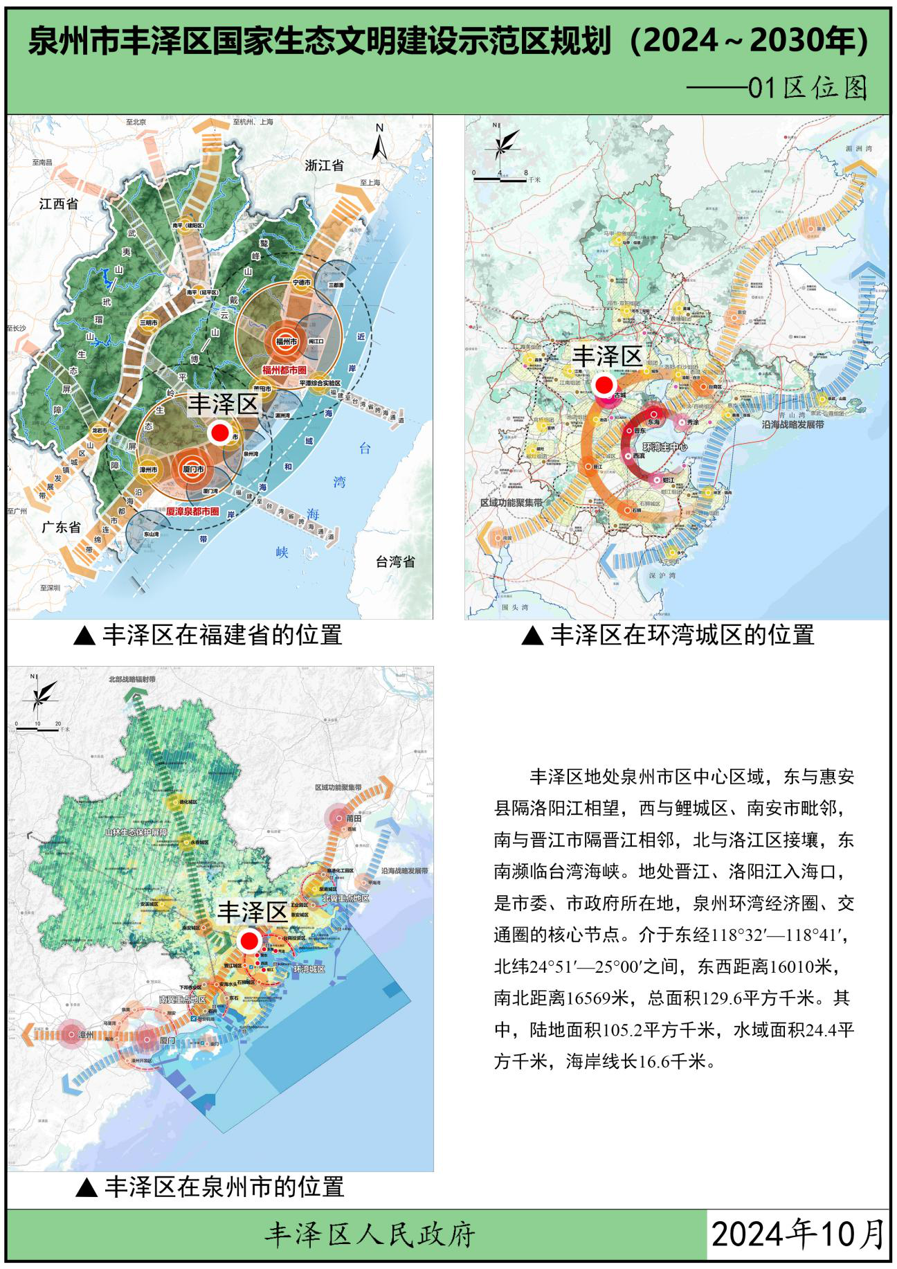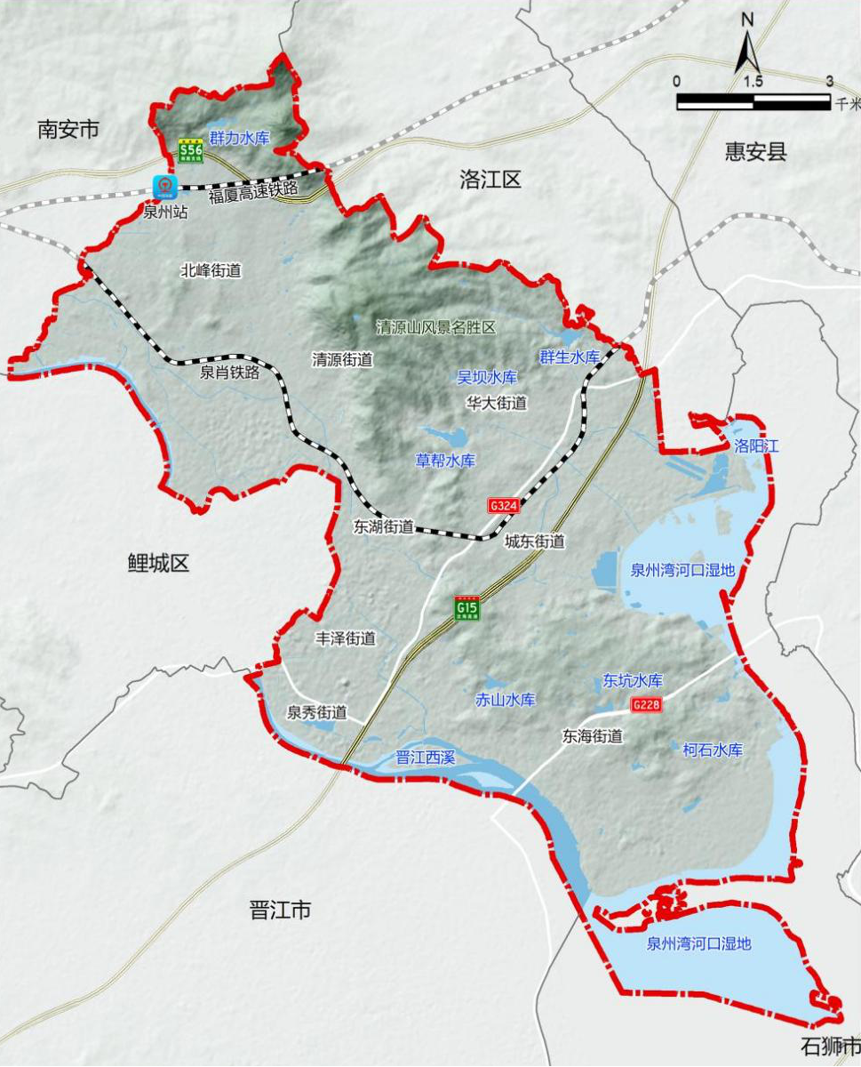 地理位置。丰泽区隶属于福建省泉州市,地处泉州市区中心区域,是泉州市委、市政府所在地,是泉州环湾经济圈、交通圈的核心节点。丰泽区位于晋江下游北岸、洛阳江下游南岸,东与惠安县隔洛阳江相望,西与鲤城区、南安市毗邻,南与晋江市隔晋江相邻,北与洛江区接壤,东南濒临台湾海峡。总面积129.6平方千米,其中,陆地面积105.2平方千米,水域面积24.4平方千米,海岸线长21.26千米。