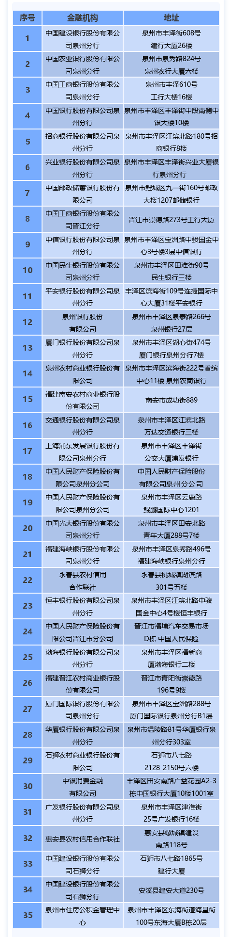 截至目前,泉州市行政服务中心已与市区35家金融机构签约直连,办理抵押权首次登记与抵押权注销登记实现一趟不用跑,业主无需至登记机构办理,可直接通过银行端实现线上办理。35家机构名称及地址: