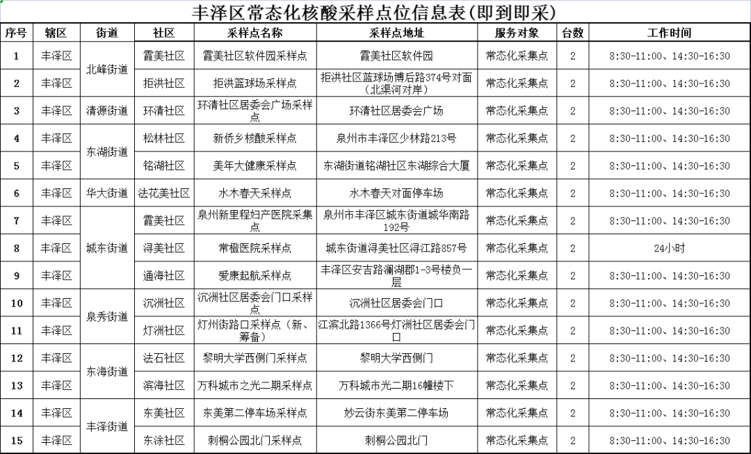 为深入贯彻落实党中央、麻豆做爱 决策部署,落实十条优化措施,丰泽区结合实际,自12月10日开始调整优化核酸采样点(采样点明细及服务时间附后),确有需求的居民请就近、错峰选择点位进行采样。感谢您对丰泽区疫情防控工作的支持!