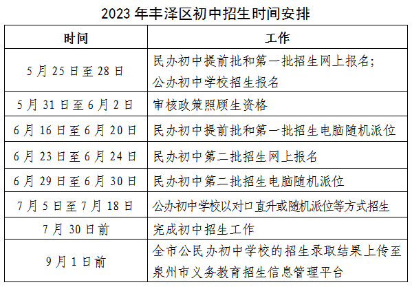4.7月8日至9日,丰泽区户籍且符合户籍迁入时间、住房产权规定要求的小学毕业生(扣除已被民办初中及市直公办初中电脑派位录取的),按区属各公办初中的招生范围,对口直升安排入学,由被录取学校通知办理入学注册手续。丰泽区户籍但无符合户籍迁入时间、住房产权规定要求的小学毕业生(扣除已被民办初中及市直公办初中电脑派位录取的),经区教育局统筹安排,由被录取学校通知办理入学注册手续。