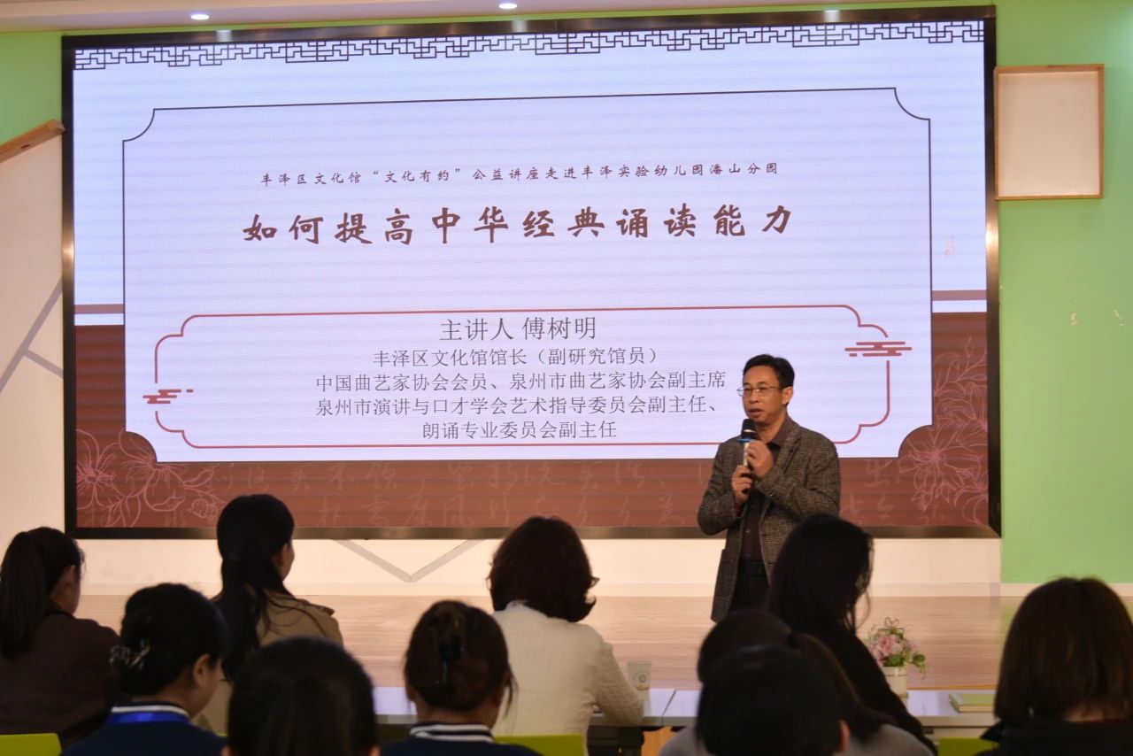 近日,丰泽区“文化有约”公益讲堂走进丰泽区实验幼儿园潘山分园,为该园教师及清源片区的教师开展以《如何提高中华经典诵读能力》为题的讲座。