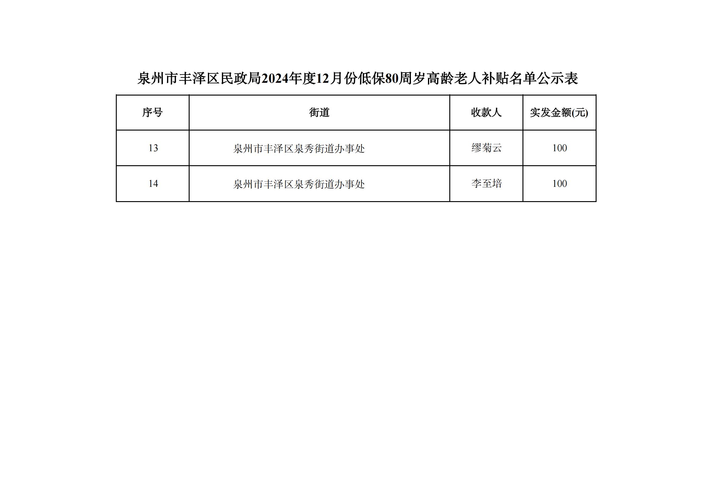 泉州市丰泽区民政局2024年度12月份低保80周岁高龄老人补贴名单公示表(泉秀)